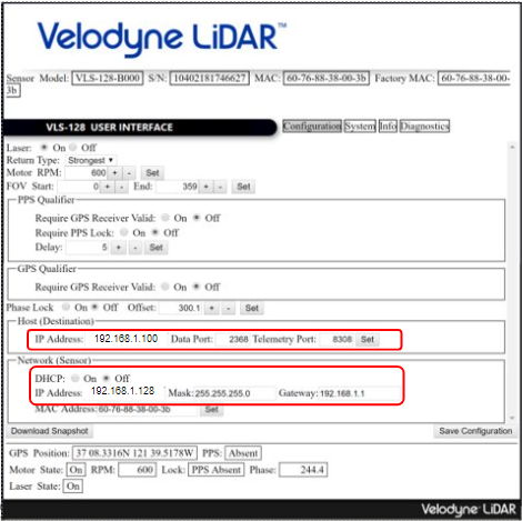 LiDAR 장비에 설정된 default IP를 알고 있다면 WireShark 과정 없이 바로 Web Inerface를 확인하면 됩니다. 설정한 IP를 까먹은 경우 위와 같이 찾을 수 있습니다. 웹 브라우저에 Source IP(192.168.1.128)를 입력하면 다음과 같은 화면이 뜨게 됩니다.