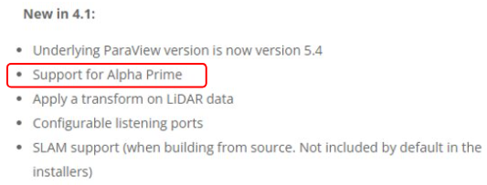 Veloview를 설치해야 합니다. Veloview Version에 따라 지원하는 LiDAR가 다르기 때문에 먼저 이를 확인합니다. Alpha Prime의 경우 4.1을 설치하면 됩니다.