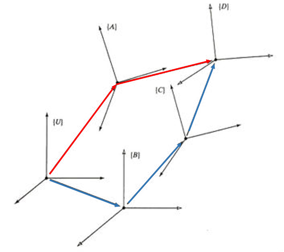 아래 그림에서 Transform에 관한 몇 가지 insight를 얻을 수 있습니다. 빨간 화살표와 파란 화살표는 각 각 Frame 간의 관계인 Transform을 나타냅니다. Frame 간 관계는 3차원 공간 상에서 Translation(평행 이동), Rotation(회전 이동)으로 나타낼 수 있습니다. U Frame에서 D Frame까지의 Transform은 빨간 화살표를 따라 계산할 수도 있고 파란 화살표를 따라 계산할 수도 있습니다.
